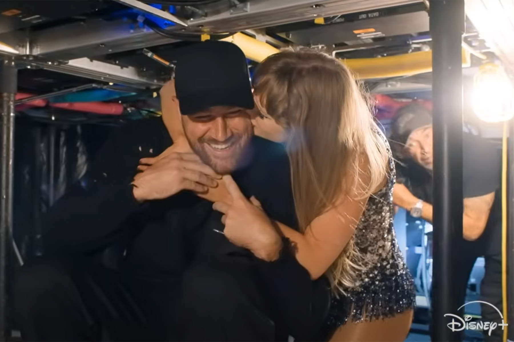 In an intimate backstage highlight, Taylor Swift shares a moment with Travis Kelce, her now-fiancé, reflecting their personal and professional collaboration during the tour. The trailer includes scenes of Kelce under the stage and Swift planting a kiss on his cheek, a testament to their strong bond.